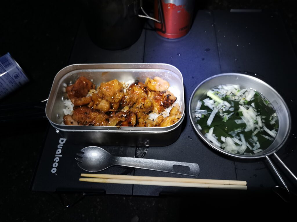 6日目夕食 揚げ鶏、タン塩丼、サラダ