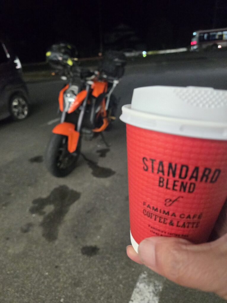4号線に出たところでコーヒーブレイク。雨がポツポツ。白石インターから高速に乗るが、ついに雨が降ってきたので菅生SAでカッパを着用。