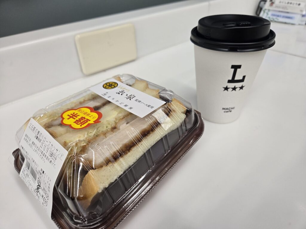 暗くなって疲れもたまった。ローソンでカフェラテ。カツサンド半額だったので買ったが、いざ食べようとしたら食欲が出なかったので持って帰った。