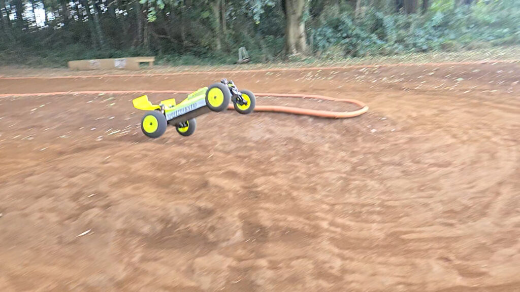 足回りの改善により走破性は良くなったと思います。路面の違いの影響もあるかもしれませんが、前回かなり強いオーバーステアが、スピンしにくい程度には収まっていました。しかし、凸凹の部分に関しては期待したほどの走破性改善は無く、かなり姿勢を乱されて苦労しました。走らせていて神経を使うというかストレスがたまる動きでしたが、一応タイムは大幅に改善し、MO1.0にも迫ることができました。