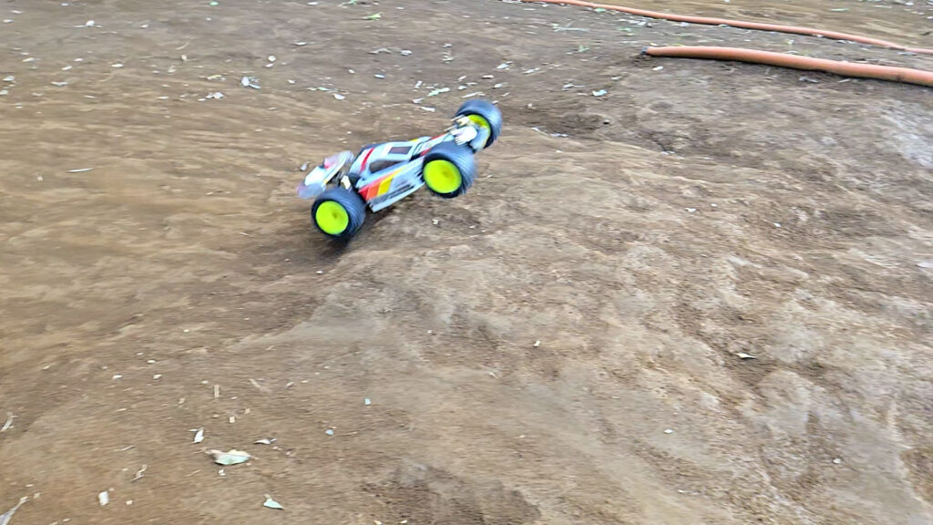 ブリッツァービートルのタイヤはピンが尖っていてグリップが良いのではないかと期待したのですが、全く逆の結果となりました。驚くほどグリップ感が無く、氷とは言わないまでも、ガラスの上を走っているような感覚でした。しかし、加速やコーナーへの進入速度をちゃんとグリップレベルに合わせてあげればちゃんと走ってくれました。タイヤが大きくなった分、凸凹ポイントでの走破性は少し改善したようにも思いますが、単にスピードが遅かったから暴れなかっただけかもしれません。